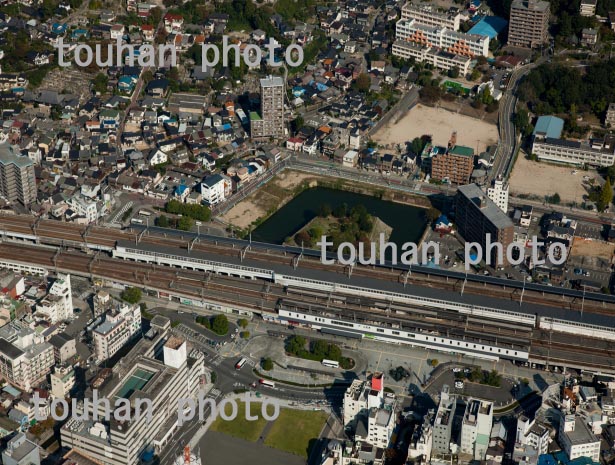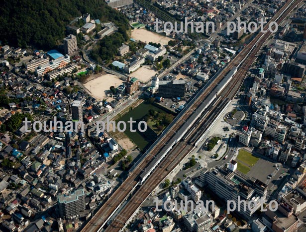 三原城跡(三原駅舎に食い込城跡)と三原駅(2013/10)