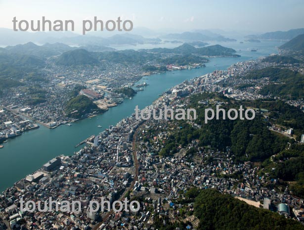 瀬戸内海より竹原駅、竹原港と竹原市街地(2013/9)