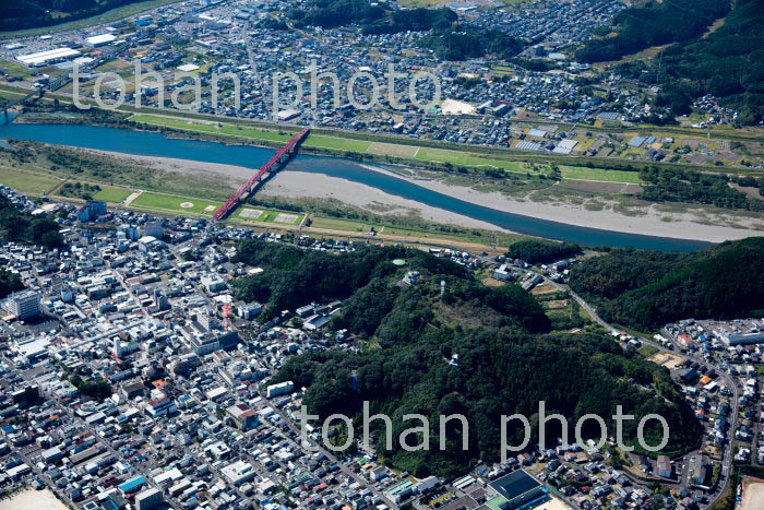 四万十川橋と四万十川より中村城跡(為松公園)と四万十市の街並み(2018/10)