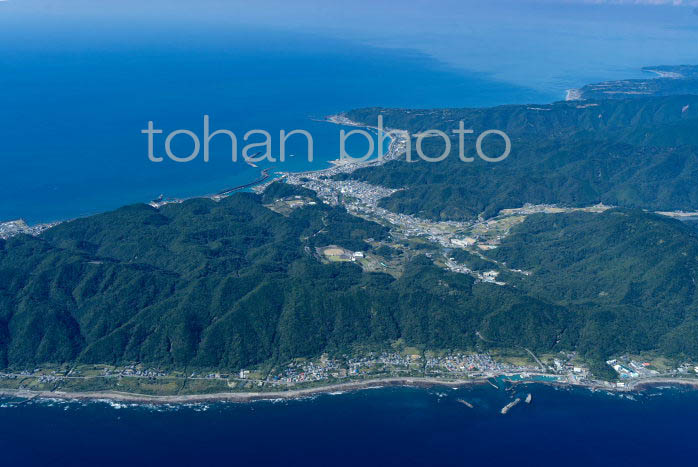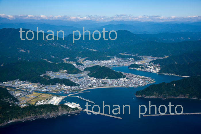 久礼湾より土佐久礼駅と中土佐の街並み(2018/10)