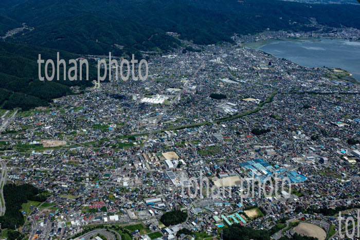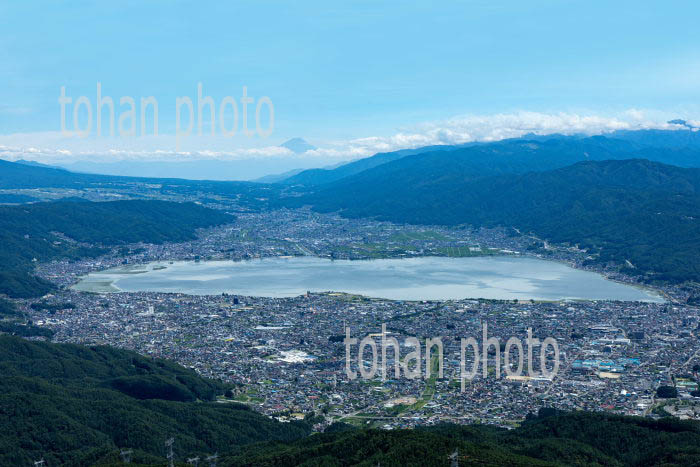 諏訪湖,岡谷市,諏訪市の街並みより富士山