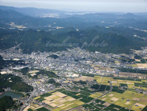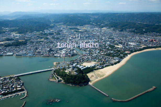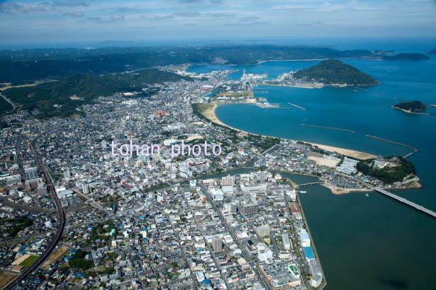 唐津市街地と唐津駅周辺より西の浜と唐津港(2015/10)