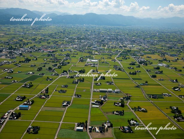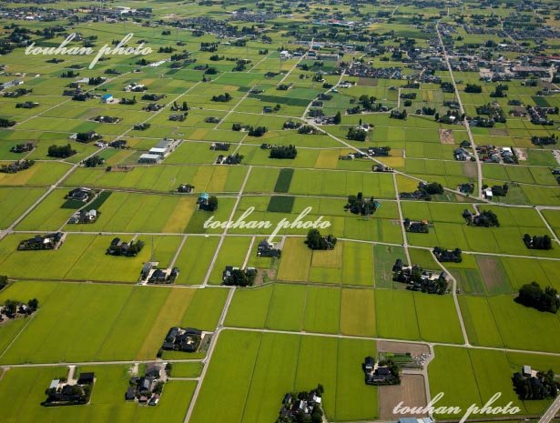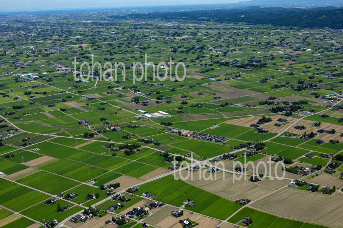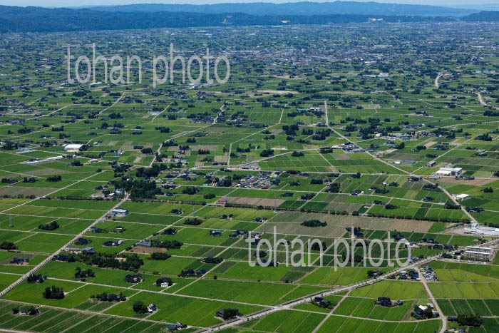砺波平野の散村風景(三浦東,沖地区より砺波の町方面)