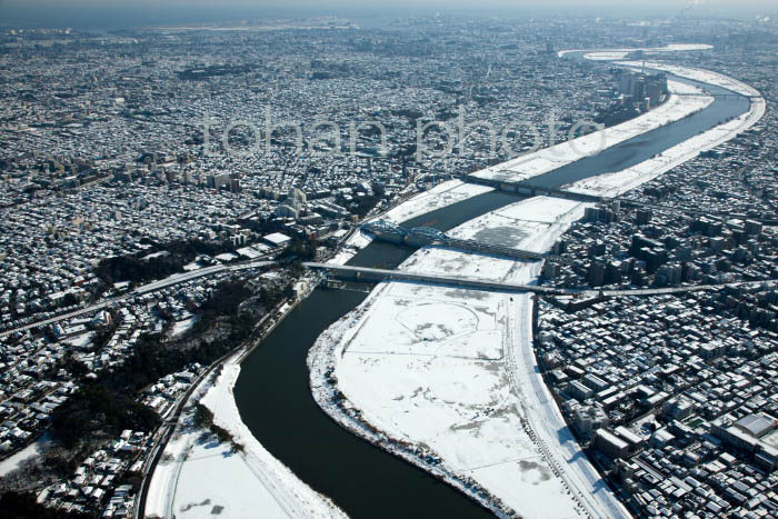 雪景色の多摩川と多摩川駅,丸子橋周辺-20130115