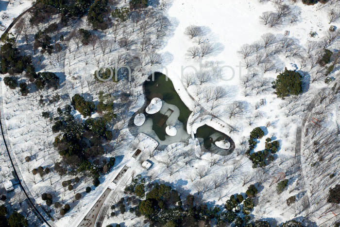 雪景色の代々木公園の中央広場の池-20130115