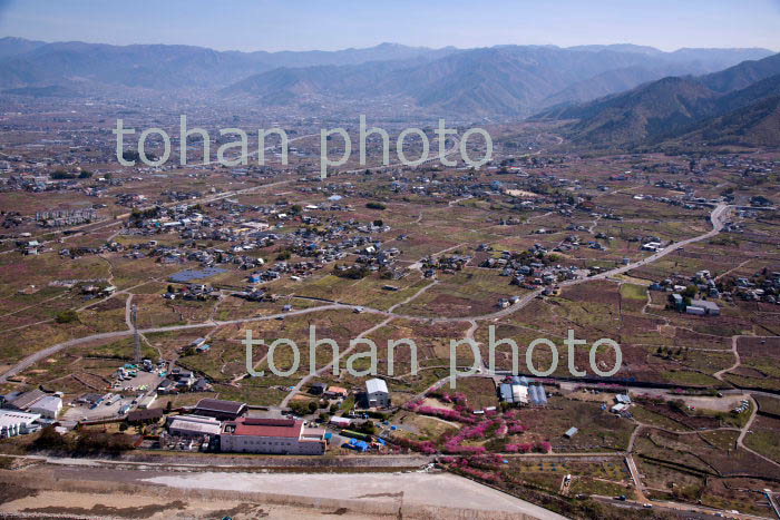桃の花満開の甲府盆地(一宮周辺より勝沼方面)2018/4