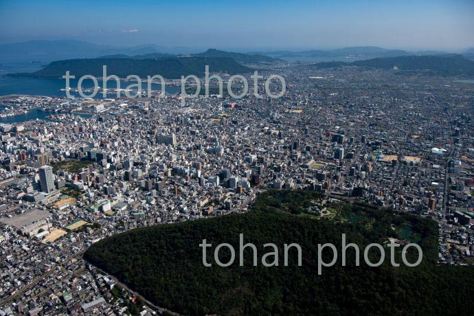 萩市街地より菊ケ浜海水浴場と萩城跡(2014/9)