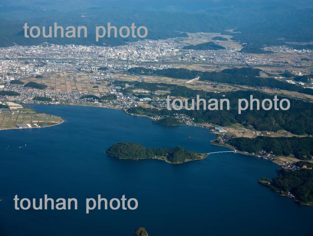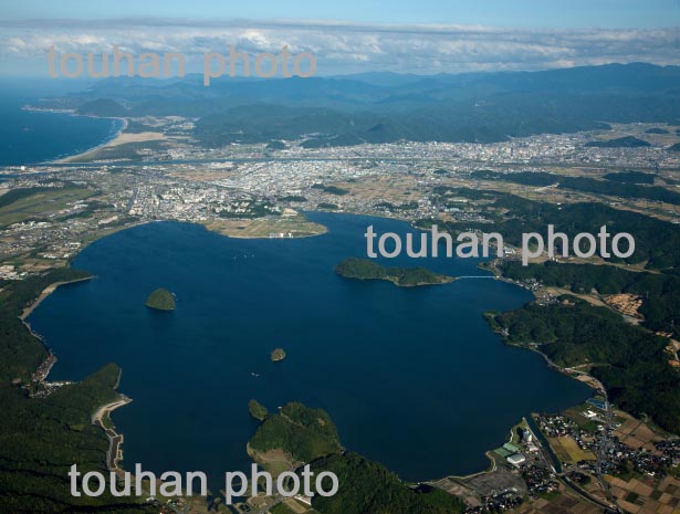 湖山湖(汽水湖)と青島と津生島より鳥取市街地と鳥取砂丘(2013/9)