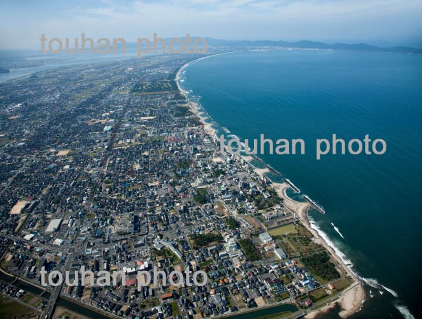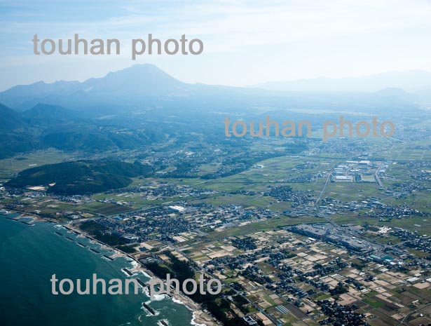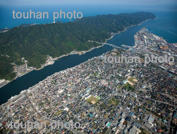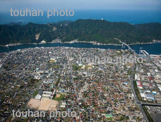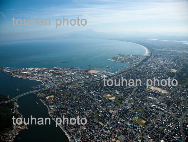 境港市街地と境港港より大山方面(弓ヶ浜の海岸線と三保湾)(2013/10)