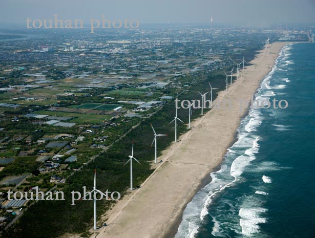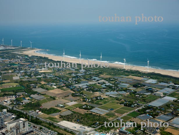 鹿島灘の風力発電の風車群と神栖ビニールハウス群(2013/5)