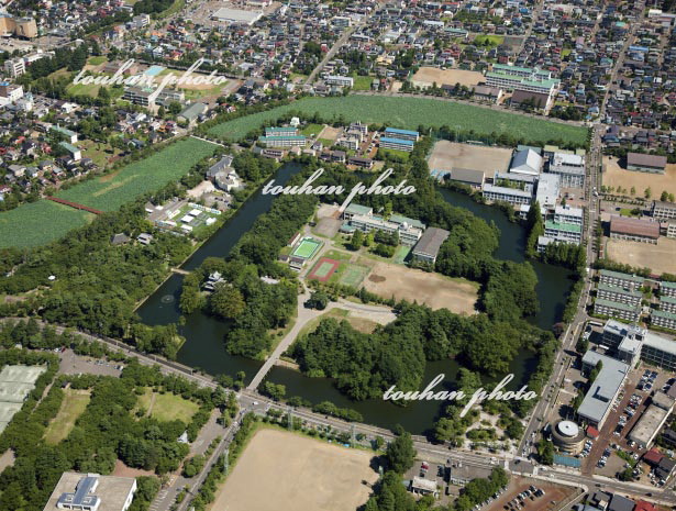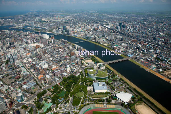 新潟県民会館、市民芸術文化会館と信濃川より新潟市街地と新潟駅(2014/8)
