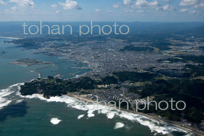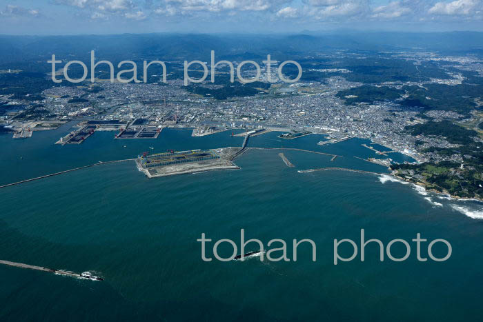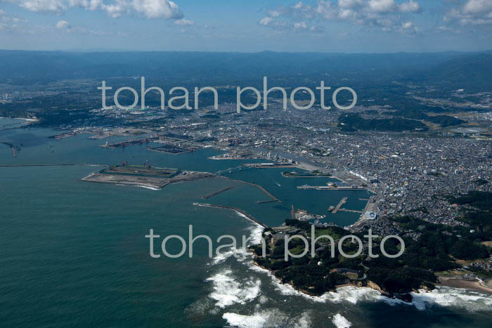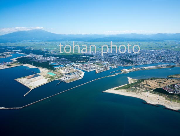 最上川河口より酒田港と酒田市街地,庄内平野,鳥海山方面(2016/8)