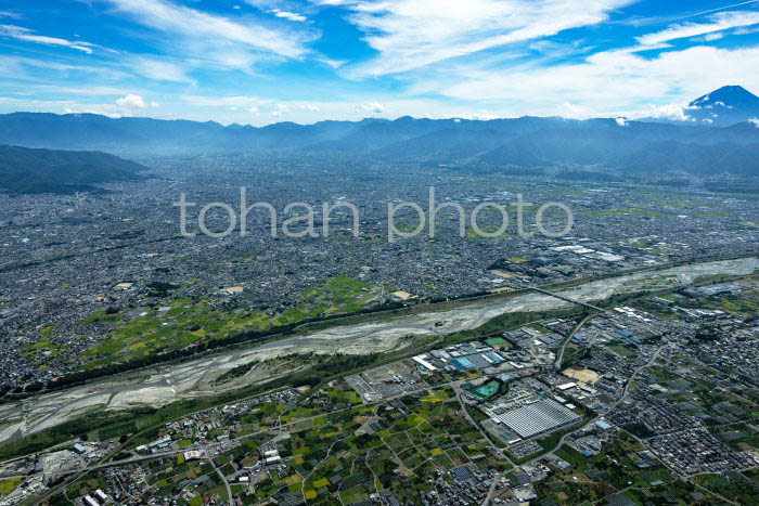甲府盆地(釜無川手前でより甲府市街地と富士山)(202391)