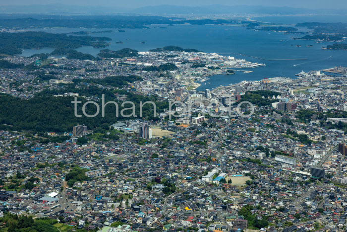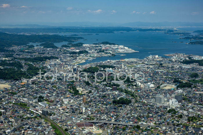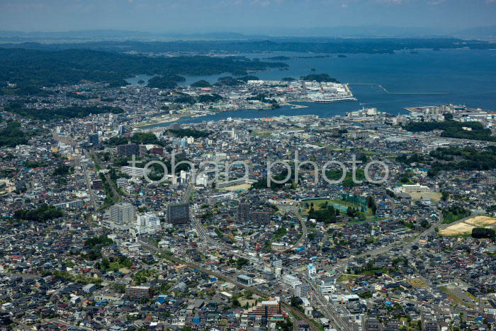塩釜駅と塩釜の街並みより塩釜湾と松島方面(2023728)