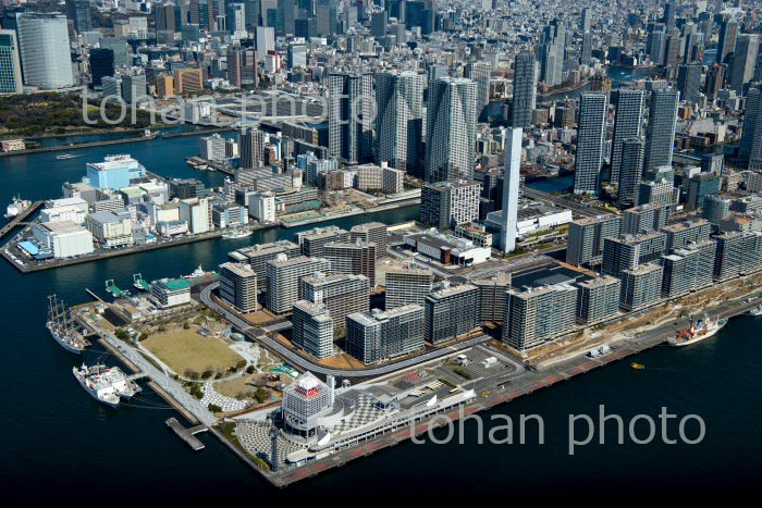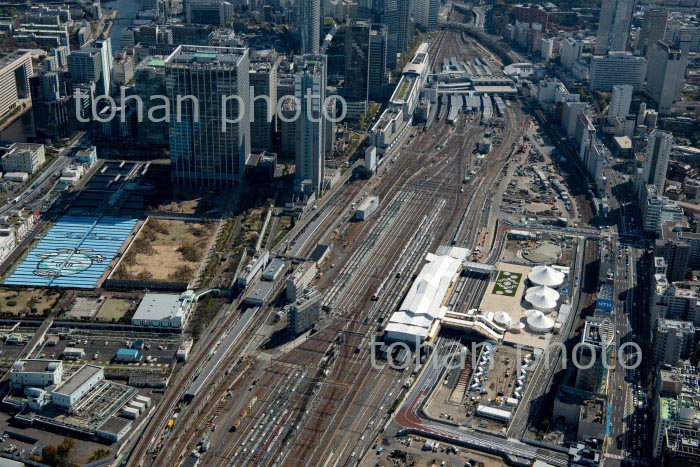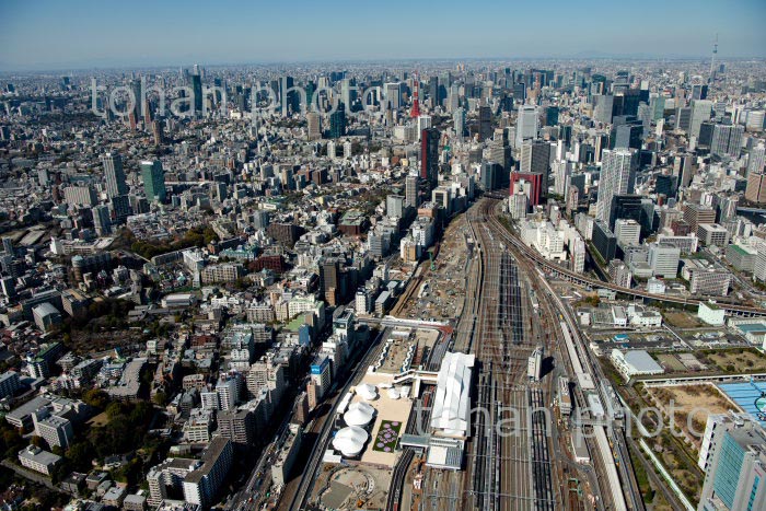 高輪ゲートウェイ駅と高輪,泉岳寺周辺より田町駅,都心方面(2020/3)
